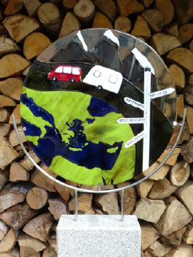 Runde Glasscheibe mit stilisierter Landkarte -östliches Mittelmeer-, Wegweiser mit Reisezielen und Applikation "Wohnwagengespann"
